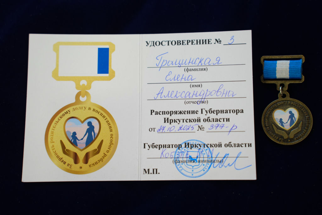 Медаль «За верность родительскому долгу в воспитании особого ребенка» учреждена указом губернатора Иркутской области в сентябре 2025 года. Она нужна для общественного признания заслуг родителей, усыновителей, опекунов, осуществляющих уход за ребенком-инвалидом или инвалидом с детства, и их активного участия в поддержке инвалидов и в жизни общества. По поручению губернатора Игоря Кобзева медали матерям вручил заместитель председателя правительства Иркутской области Андрей Южаков:
