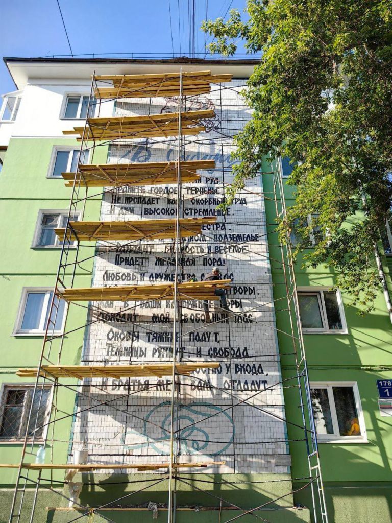 Монументальные шедевры 1960-х–1970-х годов начали ремонтировать в Ангарске. В этом году на жилых домах было восстановлено два мозаичных панно: «Послание в Сибирь», где изображено известное стихотворение Александра Пушкина с профилем поэта, и «Воин-победитель» – советский солдат на алом фоне.