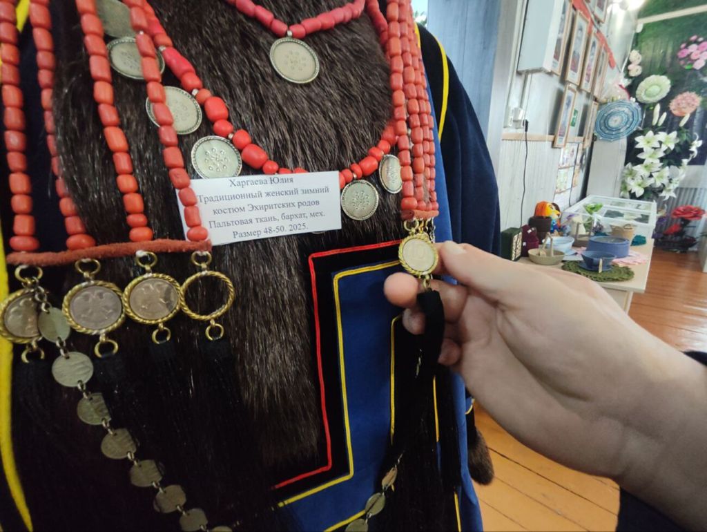 Посетители с интересом рассматривали теплые пальто «дэгэле», украшенные бусами с монетами «хоолобшо». Посетители узнали, что бусы — это не просто украшения, они выполняют и роль семейной кубышки. Монеты прикреплены так, чтобы их при необходимости легко можно было снять с основной нити.