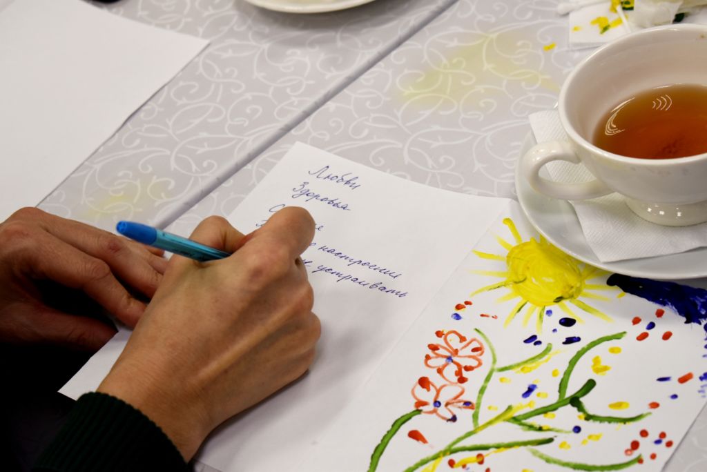 Синие, красные, зеленые незабудки расцветают на бумаге под руками пожилых людей. Они очень внимательно слушают инструкции, стараются как можно осторожнее обмакнуть ватные палочки в гуашь. Каждое поле незабудок неповторимо. На подсохших открытках сбоку или на обороте написаны теплые пожелания – здоровья, долголетия, но самое главное из них – помнить.