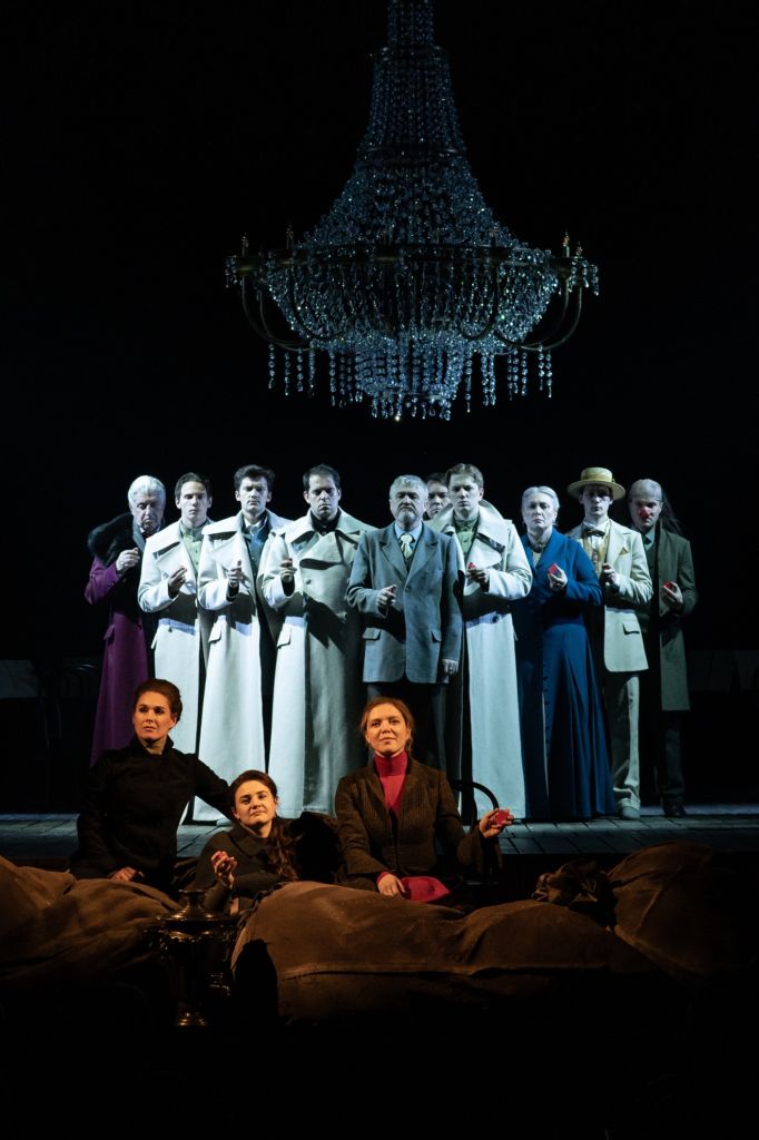 Пространство спектакля решено на контрастах. Действие разворачивается в аскетичных декорациях на дощатом помосте, а герои собираются на торжество за простым деревянным столом. Над сценой нависает роскошная многоярусная хрустальная люстра как некий символ сверкающей мечты. В первой сцене семейство Прозоровых музицирует. Старшая сестра Ольга (Анна Дружинина) играет на рояле, средняя Маша (Анна Берлова, Екатерина Константинова-Венцкене) – на виолончели, младшая Ирина (Екатерина Финк) – на кларнете, брат Андрей (Алексей Орлов) – на скрипке. Нестройный, но дружный квартет старательно выводит мелодию. Они еще полны надежд, уважения и любви друг к другу.