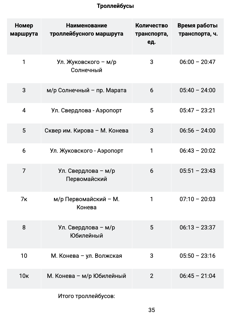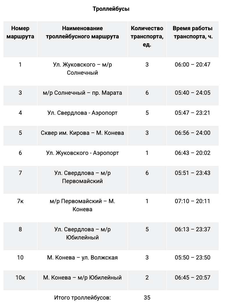 - троллейбусы: № 3 «М/р Солнечный – пр. Марата», № 4 «Ул. Свердлова – Аэропорт», № 5 «Сквер им. Кирова – М. Конева», № 7 «Ул. Свердлова – м/р Первомайский», № 8 «Ул. Свердлова – м/р Юбилейный».