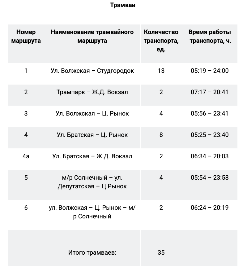 - трамваи: № 1 «Ул. Волжская – Студгородок», № 3 «Ул. Волжская – Ц. Рынок», № 4 «Ц. Рынок – ул. Братская», № 5 «М/р Солнечный – ул. Депутатская – Ц. Рынок»;
