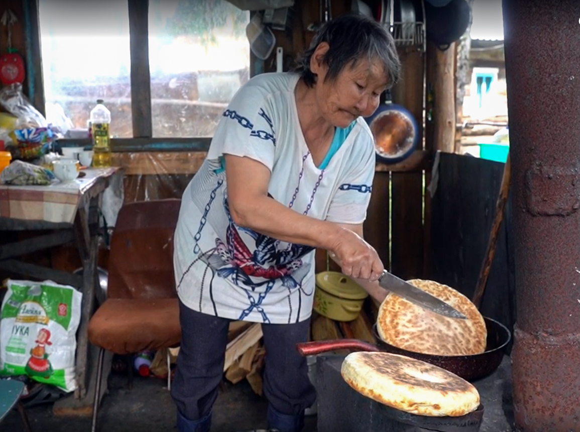 Сегодня в Иркутской области лишь в одном месте практикуют древний способ выпечки хлеба — на стойбище Ивана Лазаревича Сычегира в Катангском районе. Ответственной за хлебопечение является его старшая сестра Мария Лазаревна.