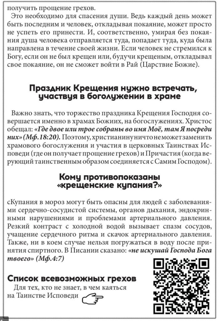 Впрочем, последнее можно сделать и в любом православном храме. Всего в регионе 19 января планируется открыть 76 иорданей в 46 населённых пунктах. Но священнослужители напоминают, что само по себе купание в ледяной воде грехов не смоет.