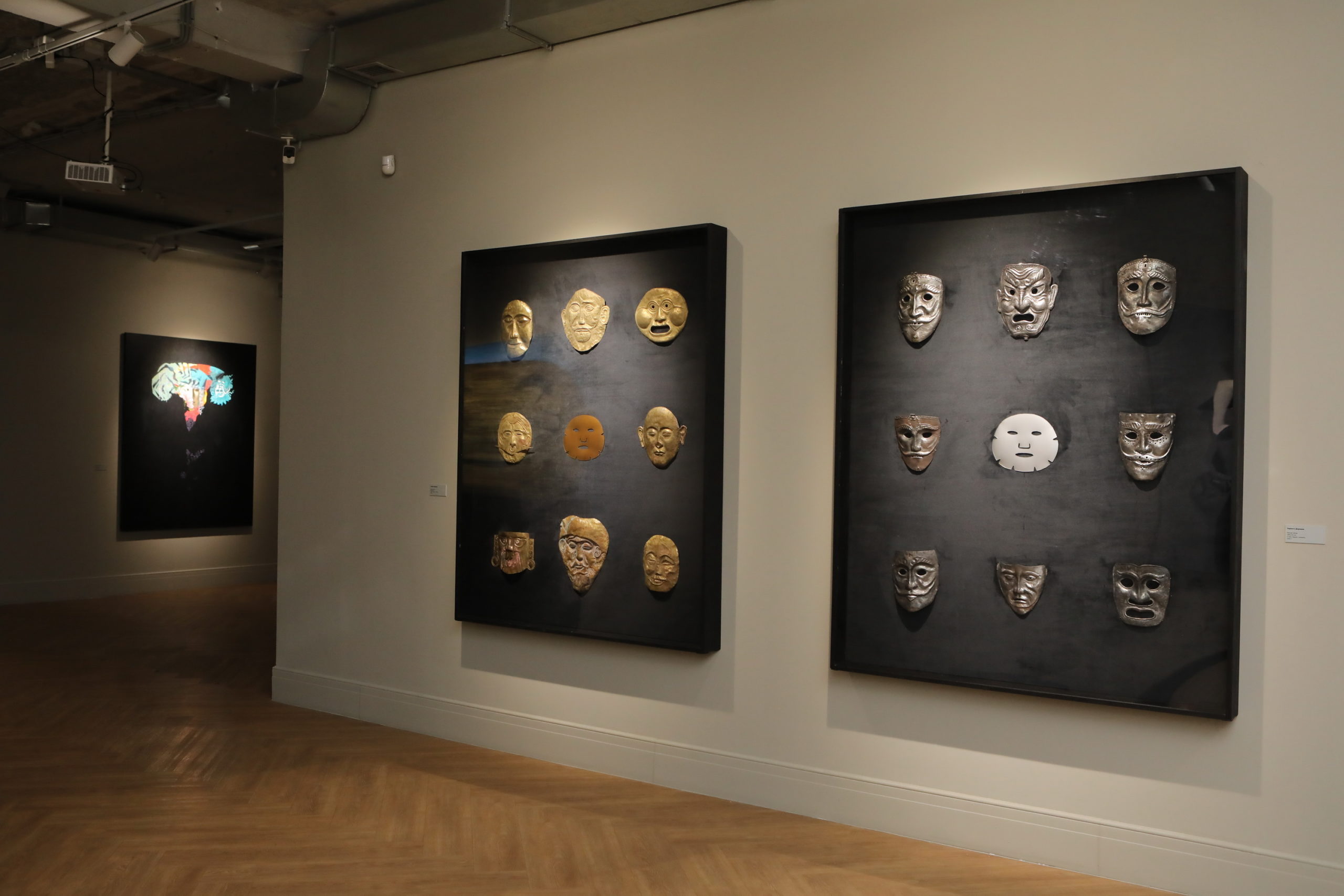 В экспозиции можно увидеть два панно с масками, выполненными в технике чеканки из разных эпох и культур в серебряном и золотом исполнении. Здесь представлены защитные, ритуальные и погребальные лики. Интересно, что в центре каждой композиции можно увидеть изображение современной тканевой косметической маски. Похожую композицию имеет живописное панно «Салон красоты» только вместо масок с пустыми глазницами на ней изображены красавицы, принимающие косметические процедуры.