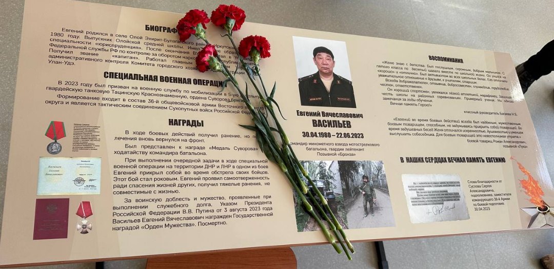 Четыре поколения семьи Васильевых из Эхирит-Булагатского района в разные годы служили Родине – воевали, трудились в тылу. Правнук фронтовика, гвардии лейтенант Евгений Васильев погиб в бою, спасая своих бойцов.