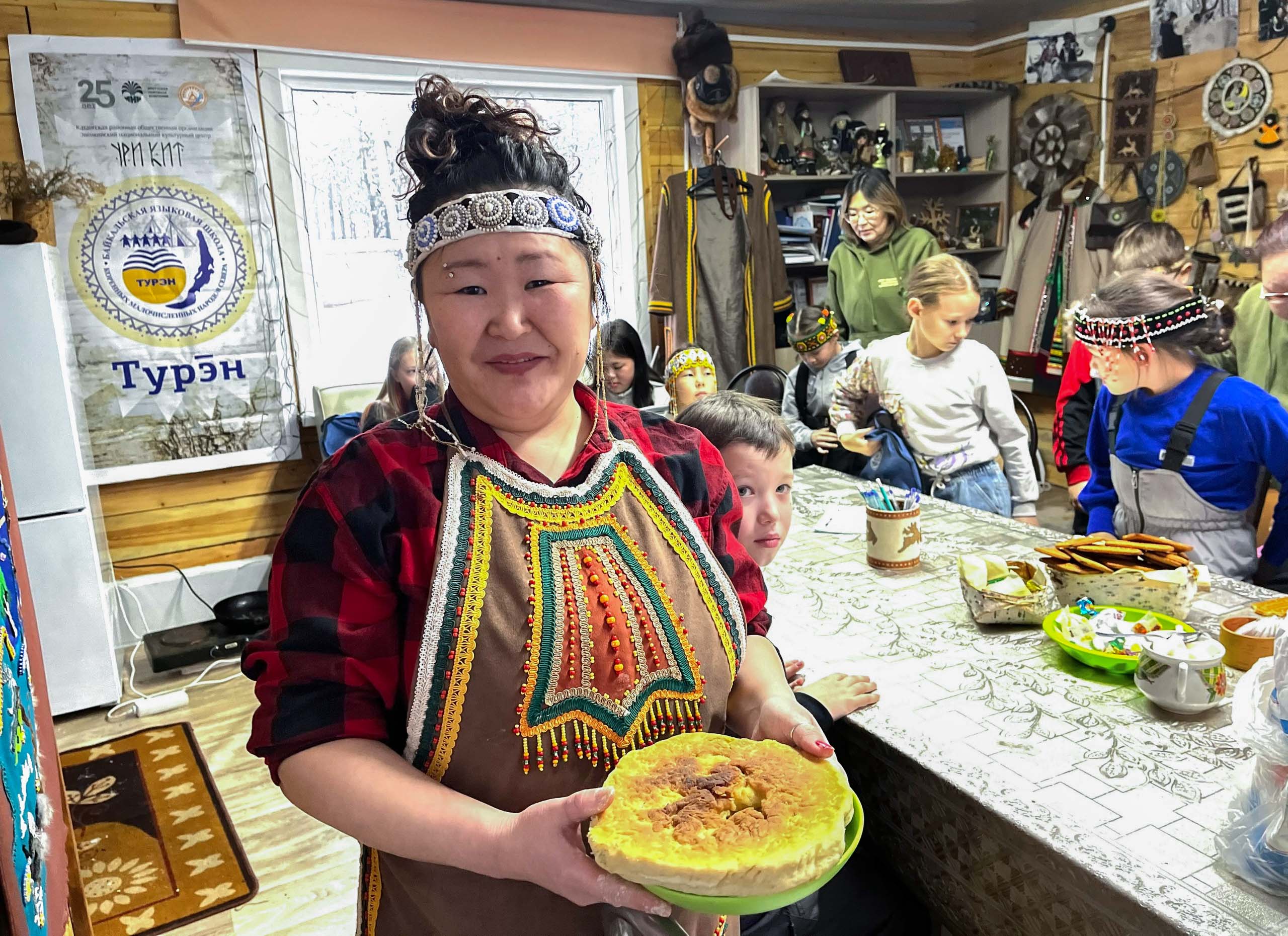 Впрочем, практические занятия не ограничились только бисероплетением. Учащиеся языковой школы познакомились с традиционной кухней эвенков. Эта часть практических уроков проходила уже в чуме, установленном на территории этноцентра «Урикит». Хозяюшки национальной кухни – Октябрина Попова, Прасковья Георгиевна Попова, Инна Иосифовна Михайлова – показали детям, как в тайге пекут хлеб, какие блюда готовят эвенки из рыбы и мяса. Для закрепления практической части испекли национальные лепешки, сварили настоящий суп из оленины.