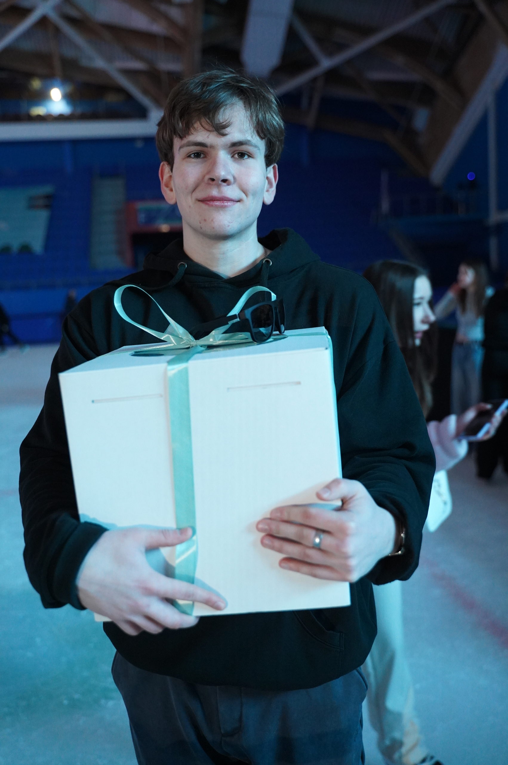 Перед массовым катанием для студентов устроили розыгрыш призов. Подарок получал тот, на кого упал случайный луч прожектора. Среди счастливчиков – Вероника Полякова, второкурсница ИРНИТУ. Девушка осваивает строительную специальность «Экспертиза и управление недвижимостью».