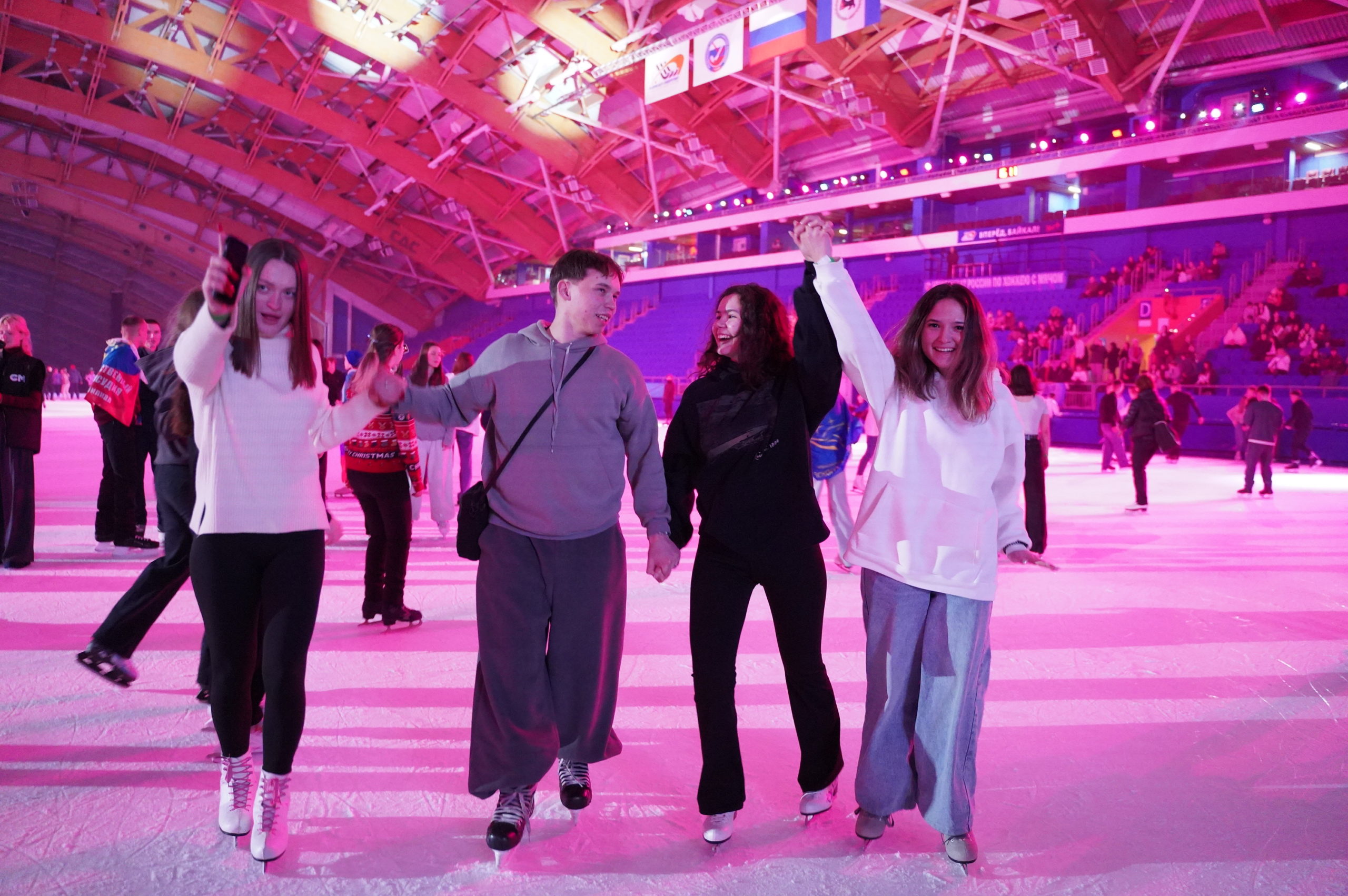 Не просто массовое катание на коньках. В ледовом дворце для студентов подготовили разнообразную программу: выступления фигуристов, световое шоу, концерт кавер-группы, награждение благодарностями Росмолодежи участников «Российских студенческих отрядов» и вручение путевки участникам акции «Снежный десант». А в честь старта Года единства народов России студенты разных национальностей исполнили массовый ёхор на льду.