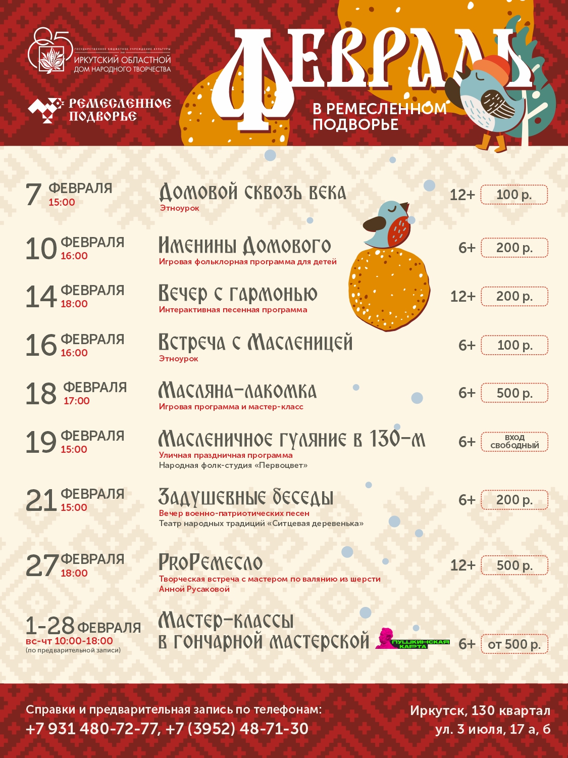 В Ремесленном подворье Иркутского областного Дома народного творчества вовсю готовятся к последнему месяцу зимы. Ребята из подворья подготовили для гостей много мероприятий: от шумных посиделок с хозяйственным Домовым до широкого Масленичного гулянья (6+).