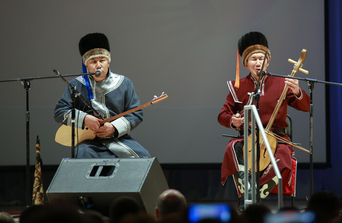 Алтайский ансамбль «Теле-Хан» продемонстрировал зрителям мастерство игры на топшуре и икили – традиционном алтайском струнном смычковом инструменте. Дуэт исполнил композицию «Чолушман», посвященную реке, питающей Телецкое озеро. Коллектив состоит из двух человек: Алана Темеева и Айдынбека Чулунова.