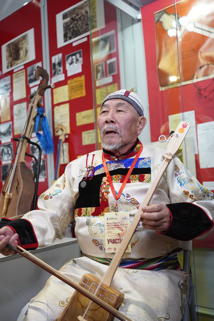 Для гостей выставки он исполнил отрывок бурятского эпоса «Гэсэр», аккомпанируя на морин-хууре, украшенном росписью – родоначальниками бурятских племен: лебедем и быком. Как рассказал Леонид Бимбаевич, по легенде, от лебедя пошли агинские, тункинские, аларские бурятские племена, от быка – иркутские. Также на инструменте есть символы Шоно Батора – главного героя одноименного героического эпоса. Дизайн росписи разработала внучка мастера.