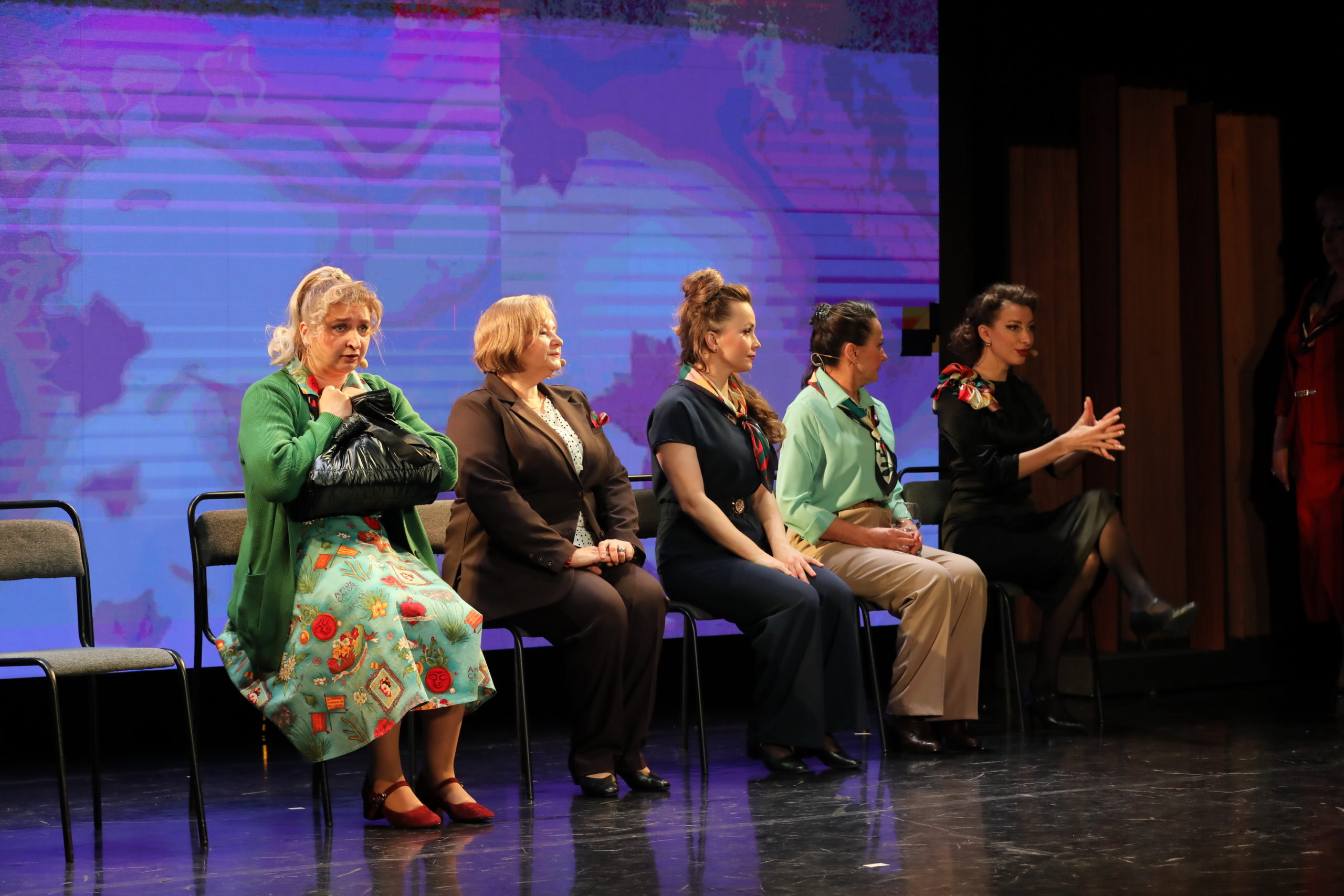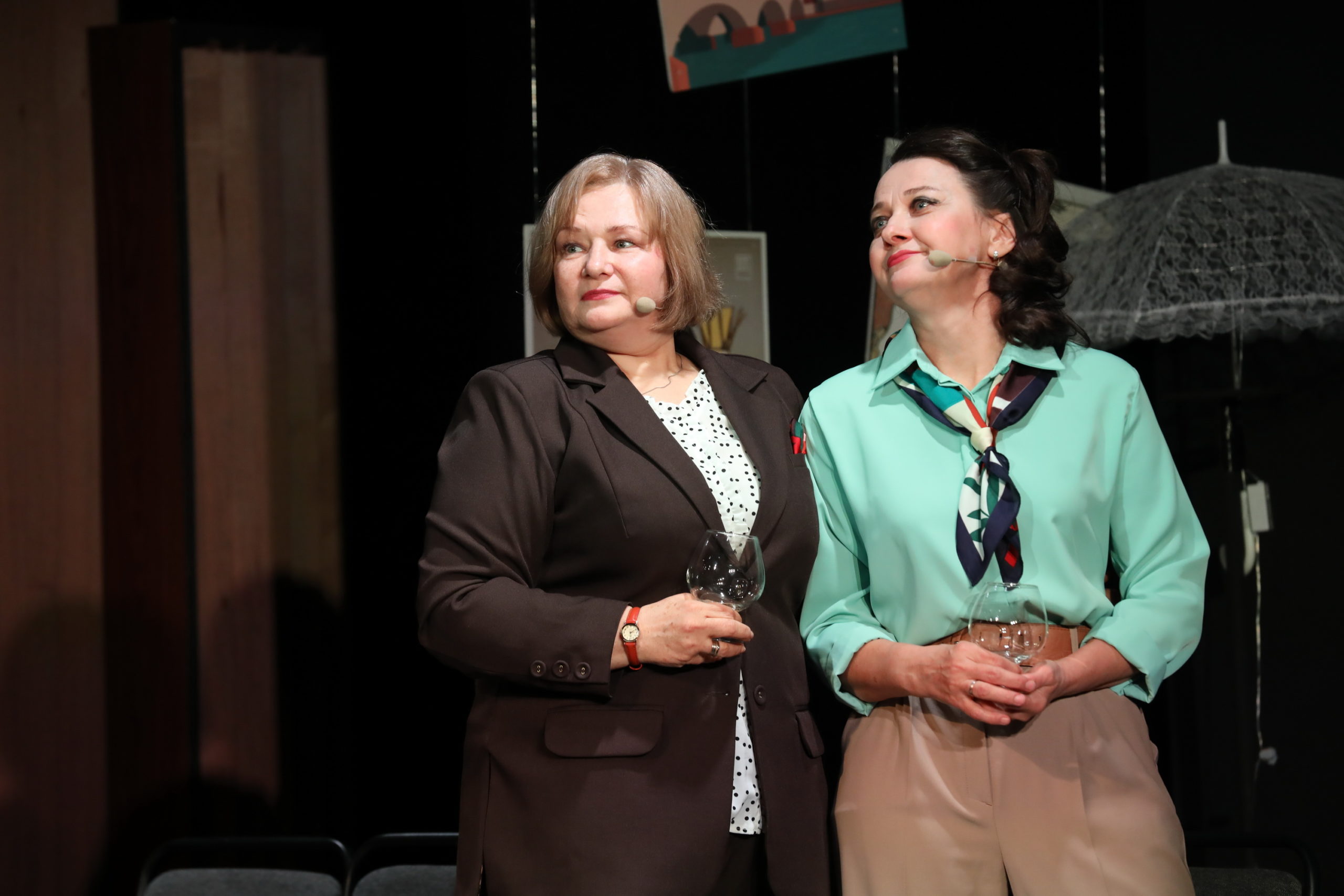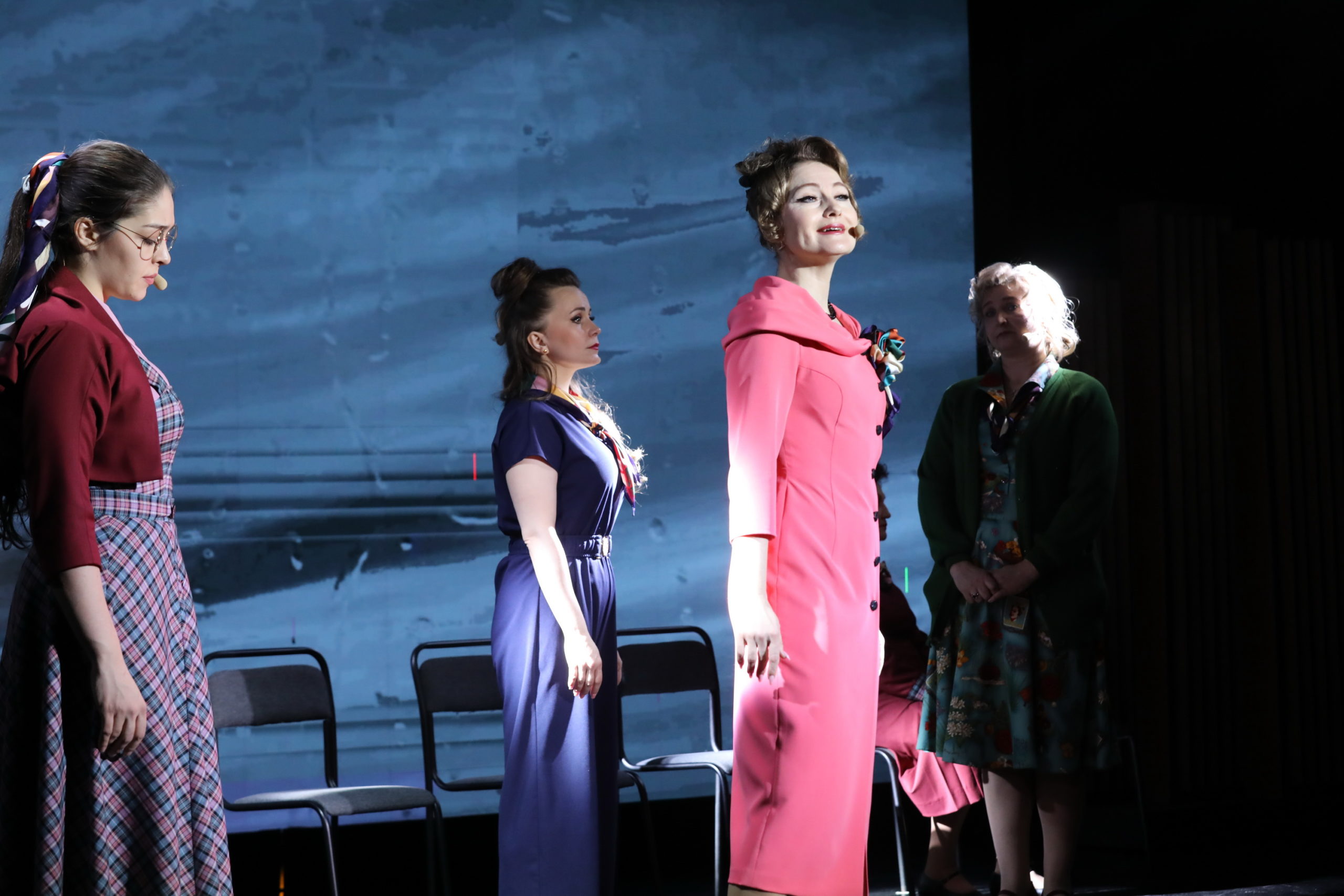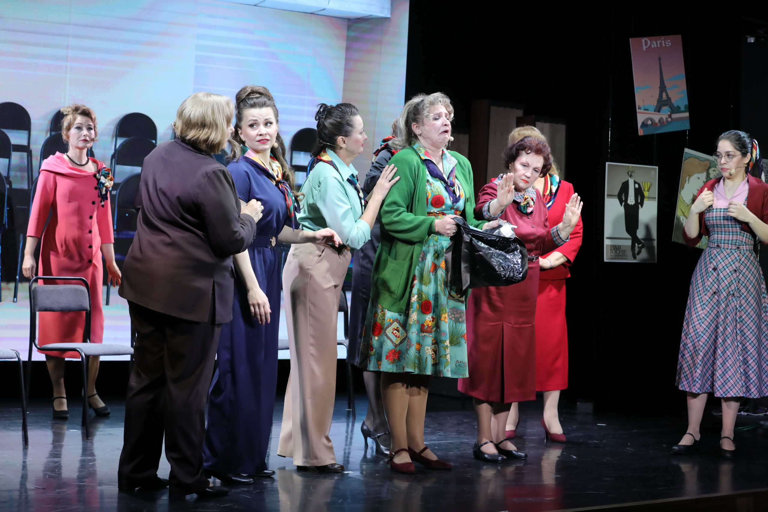 Особенность спектакля еще и в том, что здесь нет второстепенных персонажей. Все героини – главные. Это гранд-мама, инспектор хора – заслуженная артистка РФ Елена Бондаренко, дама-помощник Мария Дербина, влюбленная дама Юлия Цивилева, эффектная дама – Наталья Данилова, дама-мама – Валентина Ермошкина, дама-дочка – Анна Козырева, пробивная дама – Кристина Рагиль, болеющая и постоянно жующая дама – Юлия Панченко, дама за роялем – Светлана Лунюшкина и новая дама Юлия Пихтина.