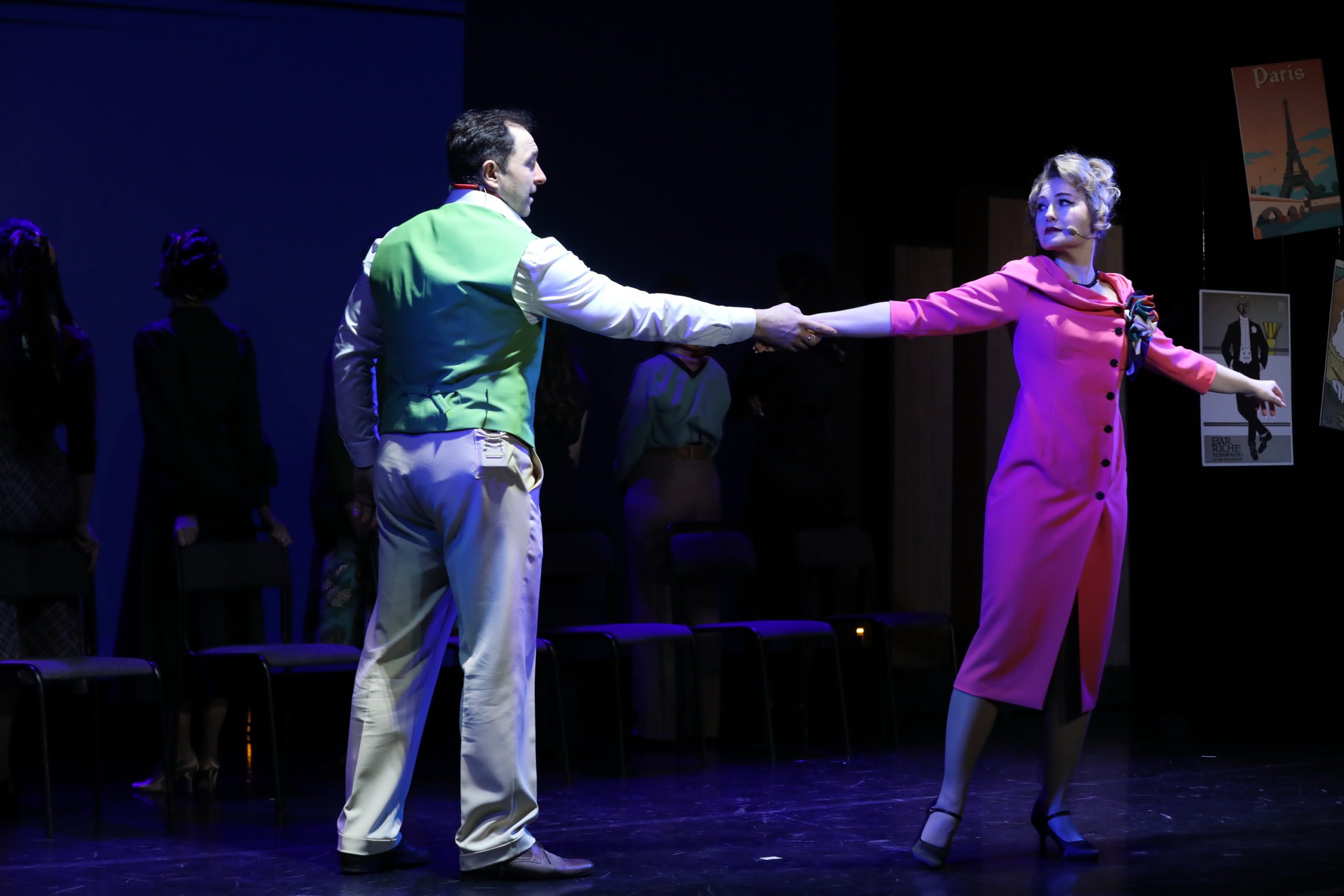 Действие спектакля происходит в атмосфере некого французского флера. В пространстве сцены, которое художник Андрей Штепин превратил в репетиционный зал, появляются плакаты с видом Эйфелевой башни и афиши в стиле ар-нуво. Кроме того, в постановке звучат французские хиты разных лет на русском языке.