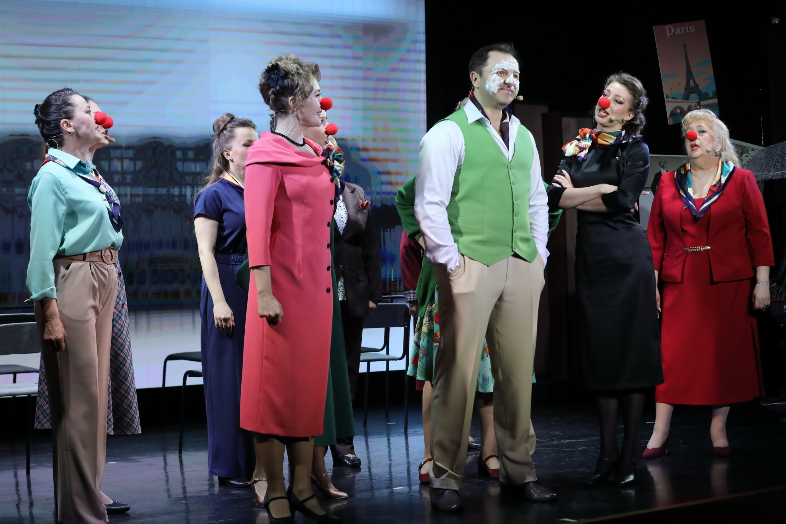 – Идея с клоунскими носами возникла, когда я вспомнил образ Эдит Пиаф с подведенными глазами, у нее было очень выразительное лицо, и она могла одной мимикой сыграть гамму эмоций, – отметил Евгений Алешин. – Это некий элемент игры, который помог за три секунды снова объединить хор, ведь в театре, как и в жизни мужчины и женщины не могут друг без друга.