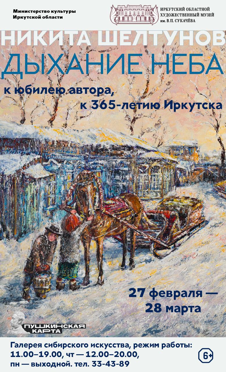 Персональная выставка Никиты Шелтунова «Дыхание неба» открывается 27 февраля в Галерее сибирского искусства Иркутского областного художественного музея им. В. П. Сукачева. Она посвящена юбилею автора и 365-летию Иркутска. В экспозиции будут представлены живописные и графические произведения, созданные иркутским художником за последние годы.
