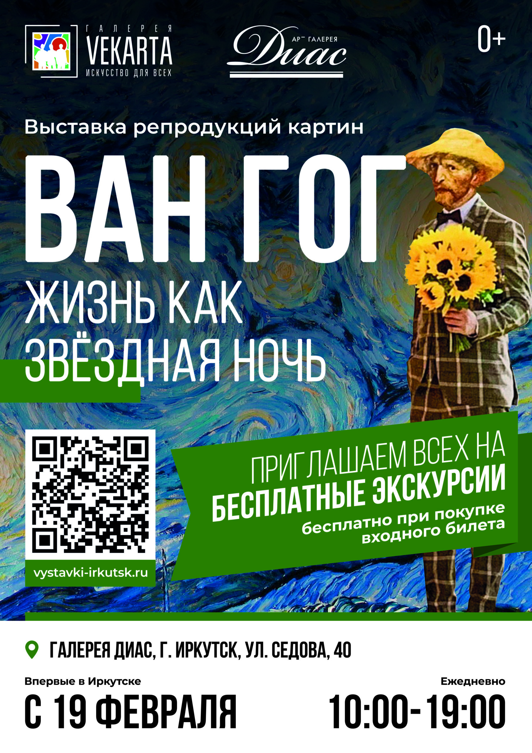 Масштабная выставка, посвященная творчеству Винсента Ван Гога, открылась в иркутской арт-галерее «Диас». Проект от Всероссийской выставочной компании VEKARTA «Ван Гог. Жизнь как Звёздная ночь» стала первым в городе опытом знакомства с работами художника в формате художественных репродукций, выполненных в технике жикле — музейном стандарте печати, позволяющем максимально точно передать цвет и фактуру оригинальных полотен.
