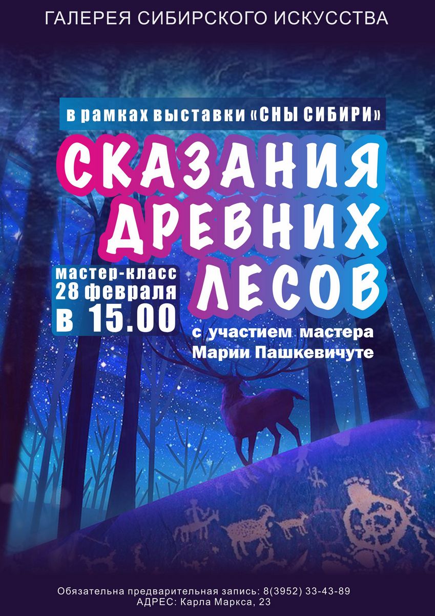 В Галерее сибирского искусства состоится мастер‑класс в рамках выставки «Сны Сибири». Вместе с мастером Марией Пашкевичуте вы сможете создать удивительные пейзажи и почувствовать дыхание живой природы. Обязательна предварительная запись по тел.: 8 (3952) 33‑43‑89.