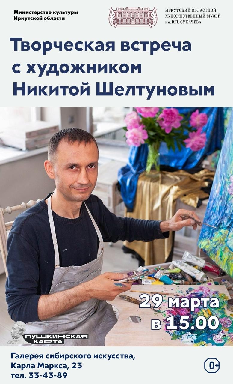 В Галерее Сибирского искусства пройдет творческая встреча с известным иркутскими живописцем и графиком Никитой Шелтуновым! Мероприятие пройдет в последний день работы его персональной выставки «Дыхание неба», посвященной юбилею автора и 365-летию города Иркутска. Гостей ждет увлекательное общение с художником, где в живом диалоге можно будет узнать о творческом пути художника, познакомиться с его произведениями и задать все интересующие вас вопросы.