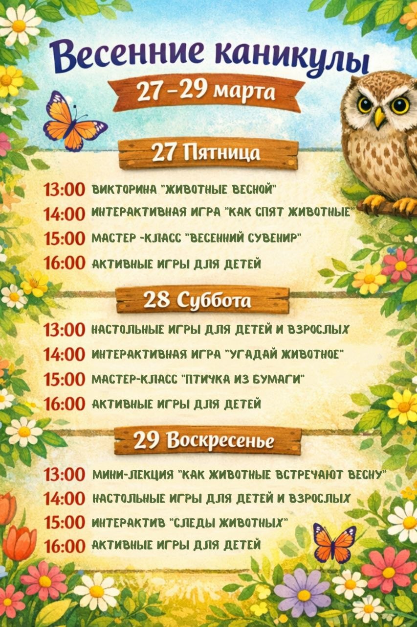 - 13:00. Мини-лекция “Как животные встречают весну”