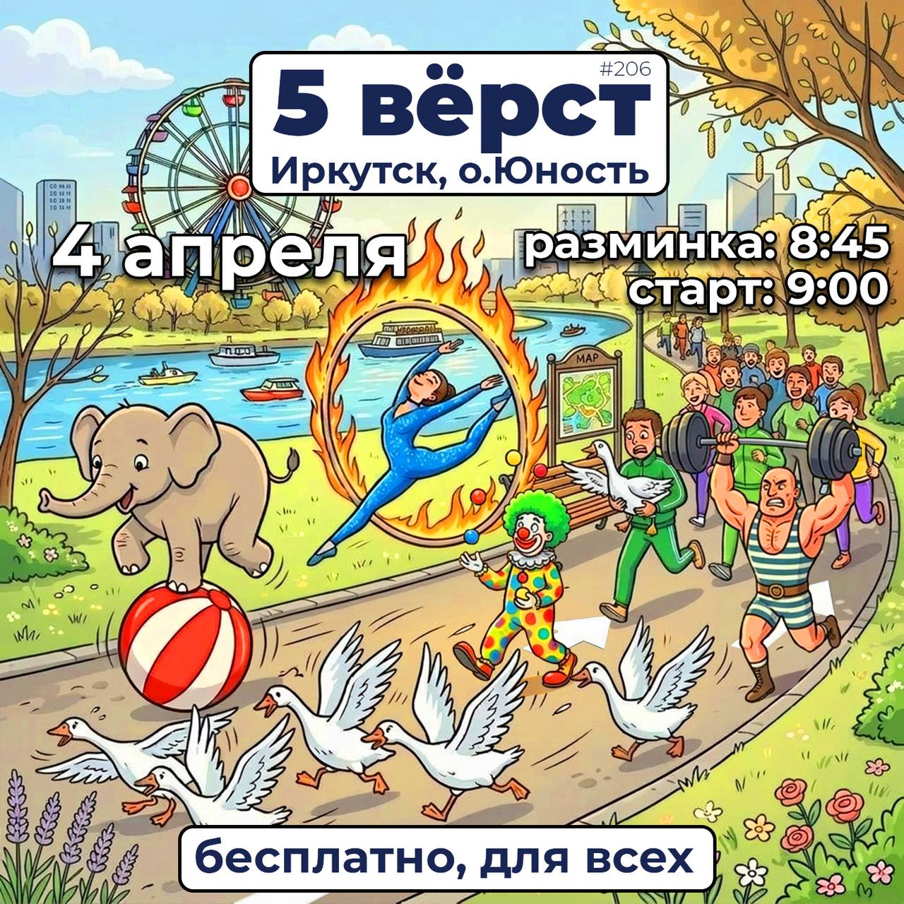 Ребята из команды «5 верст» устраивают еженедельные забеги на 5 км. В эту субботу состоится забег «с ног на голову». Вам предстоит нарядиться в яркие наряды в цирковом стиле – будет приз за лучший костюм, сделаете огненную разминку, а бегать будете по трассе в обратную сторону, шиворот-навыворот!