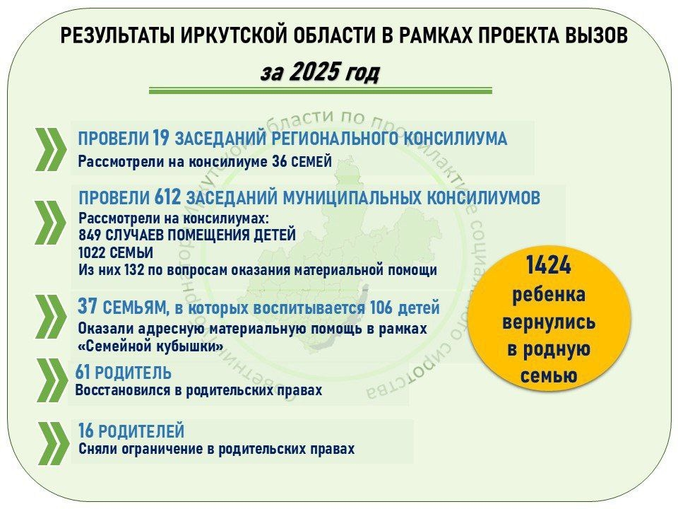 Самым важным итогом проекта стало то, что за 2025 год 1471 ребенок в Иркутской области вернулся в семью. С 1 июля 2024 года по 1 января нынешнего года удалось уменьшить численность детей, находящихся в детских учреждениях со стационарной формой пребывания, с 1462 до 968. Сокращение составило 33,8% при плане в 25%. Численность выявленных социальных сирот уменьшилась на 33% – до 349. Коечный фонд в детских учреждениях сократился на 27%. Это отражает курс на сохранение ребенка в семье и оказание помощи без изъятия из привычной среды.