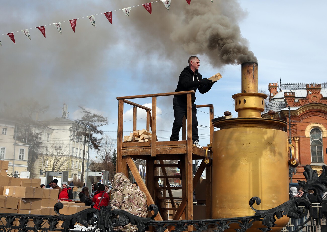 Рядом с гигантским самоваром иркутские кондитеры устроили инсталляцию из 3500 куличей. В финальной части праздника выпечку бесплатно раздавали горожанам, наливая чай из чудо-самовара.