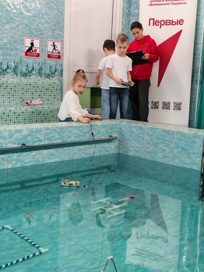 Ребята управляли настоящим подводным роботом, который мог плавать как на поверхности, так и под водой. Задания выполнялись с помощью дистанционного управления. Дети работали парами – один управлял движениями робота с помощью джойстика, а его напарник отвечал за длину троса, регулируя глубину погружения.