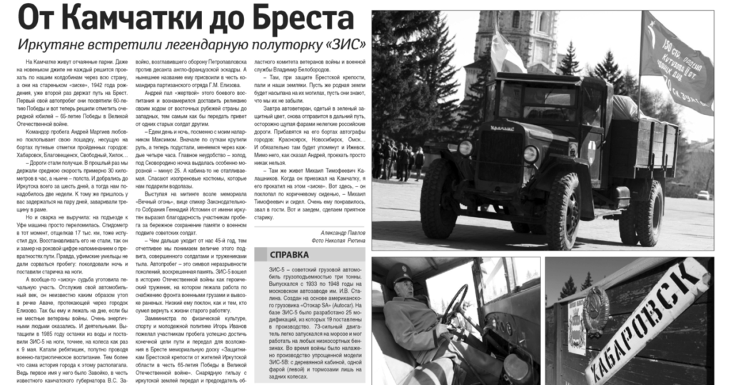 На Камчатке живут отчаянные парни. Даже на новеньком джипе не каждый решится проехать по нашим колдобинам через вою страну, а они на стареньком «зиске», 1942 года рождения, уже второй раз держат путь на Брест.