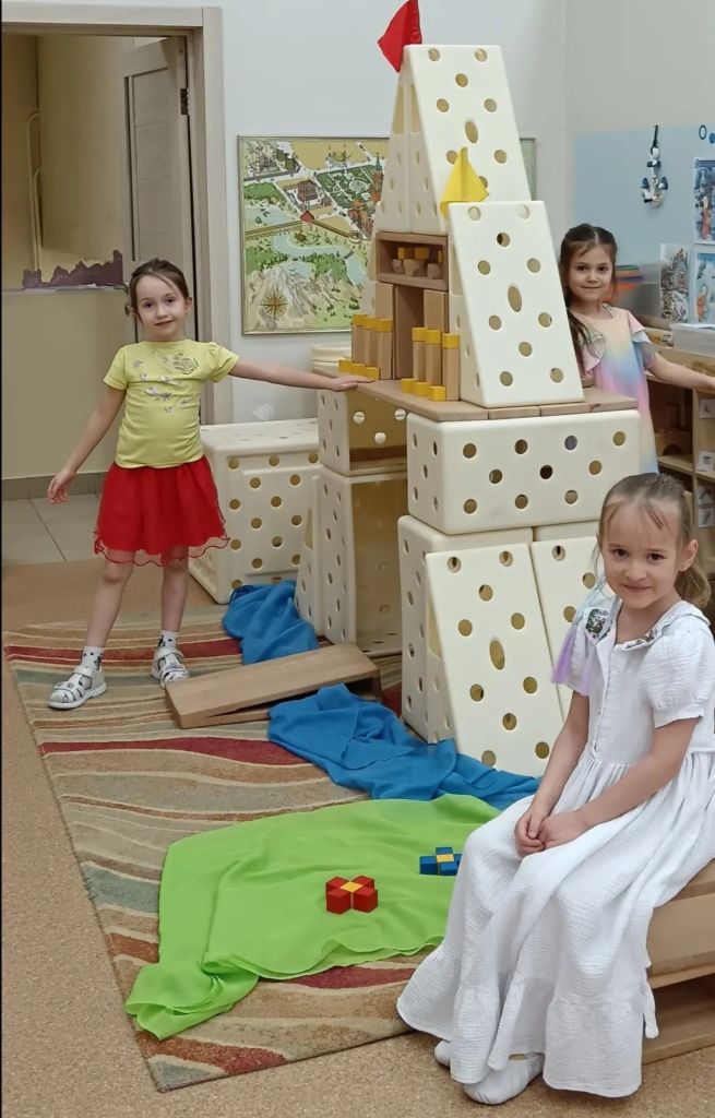 В основе методики – три конструктора: «Бабашки», «Соты» и приобретенная в рамках гранта «Стройка». Крупные деревянные элементы развивают моторику, пространственное мышление, учат планировать и договариваться. Но главное – конструктор встроен в сценарий игры. Педагоги разработали авторские сценарии занятий, взяв за основу знакомые детям сказки. Сказочный сюжет создает эмоционально понятный контекст, а профессиональные роли – строитель, архитектор, спасатель – естественным образом формируют у ребенка социально-коммуникативные навыки.